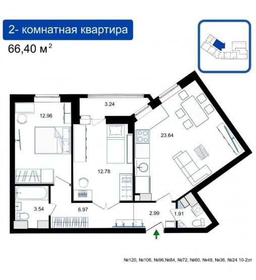 Площадь двухкомнатных квартир варьируется от 44 до 67 «квадратов». Среди них есть варианты евроформата, где размеры кухонь-гостиных достигают 24 кв. м. Также представлены квартиры с двумя санузлами.