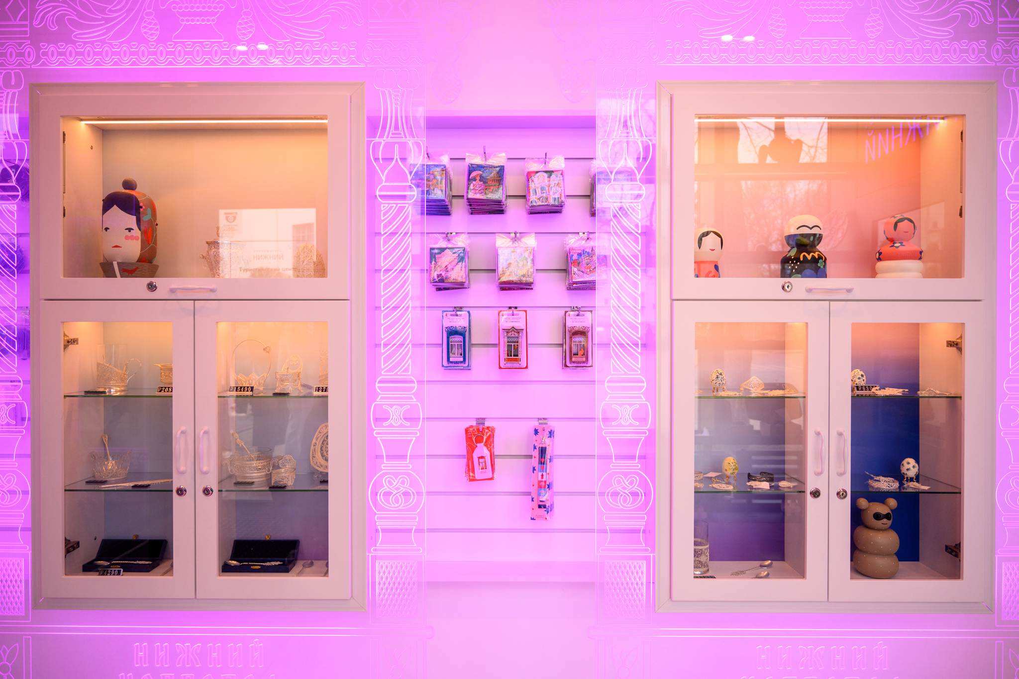 После ремонта в помещении центра появилась большая зона для сувениров. Витрины стилизовали под наличники нижегородских старинных домов. Туристам предлагают изделия народных промыслов Нижегородской области: казаковскую филигрань, предметы с хохломской росписью, борнуковскую игрушку и другие сувениры. На витринах посетители также найдут авторскую керамику и книги по краеведению.