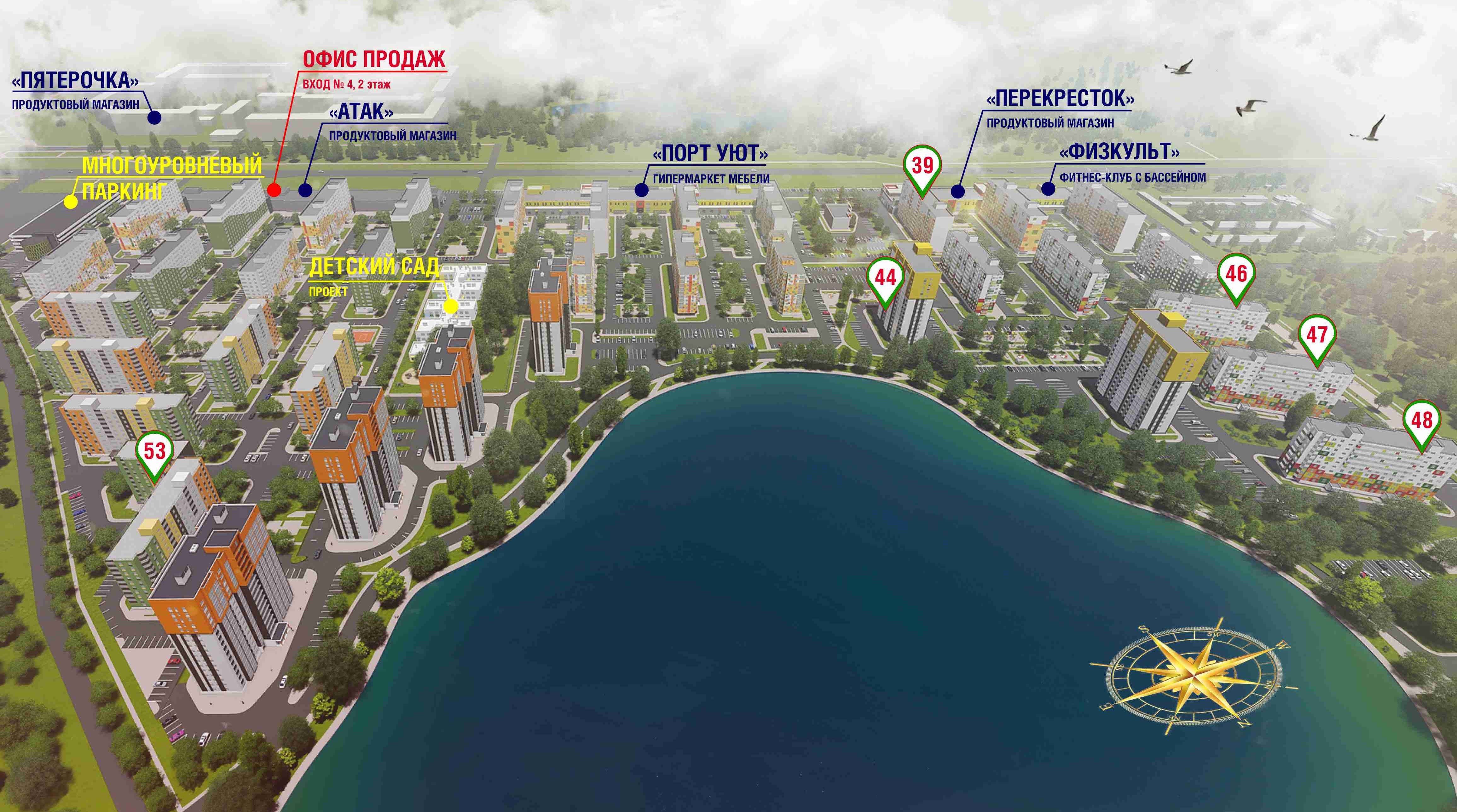 В жилом комплексе есть три больших торгово-развлекательных центра, в которых можно найти все необходимое: фитнес-клуб, мебельные товары, одежда и обувь, кафе, банки и рынок. В домах есть квартиры с разнообразной планировкой. Компактные и уютные однокомнатные, большие и просторные двух- и трехкомнатные.