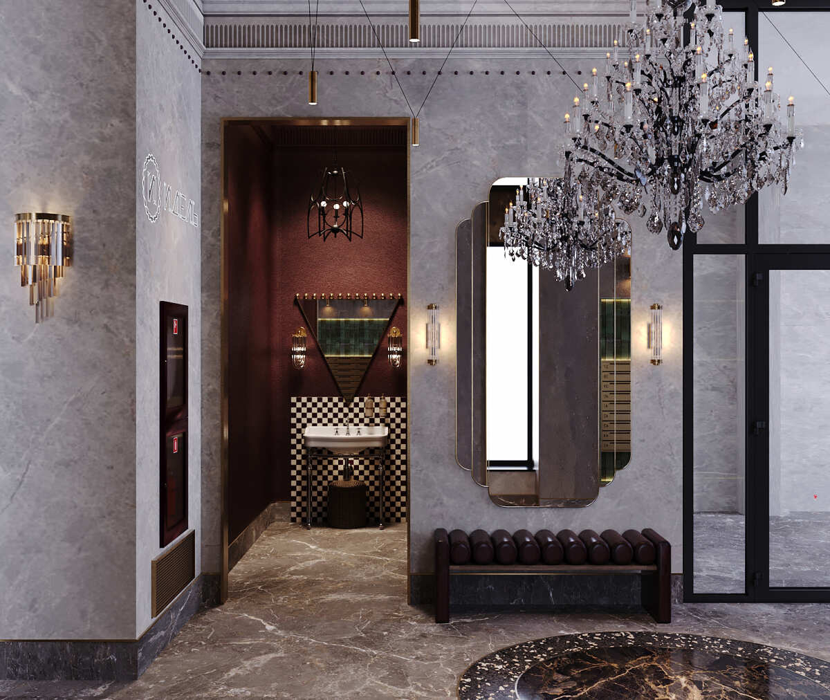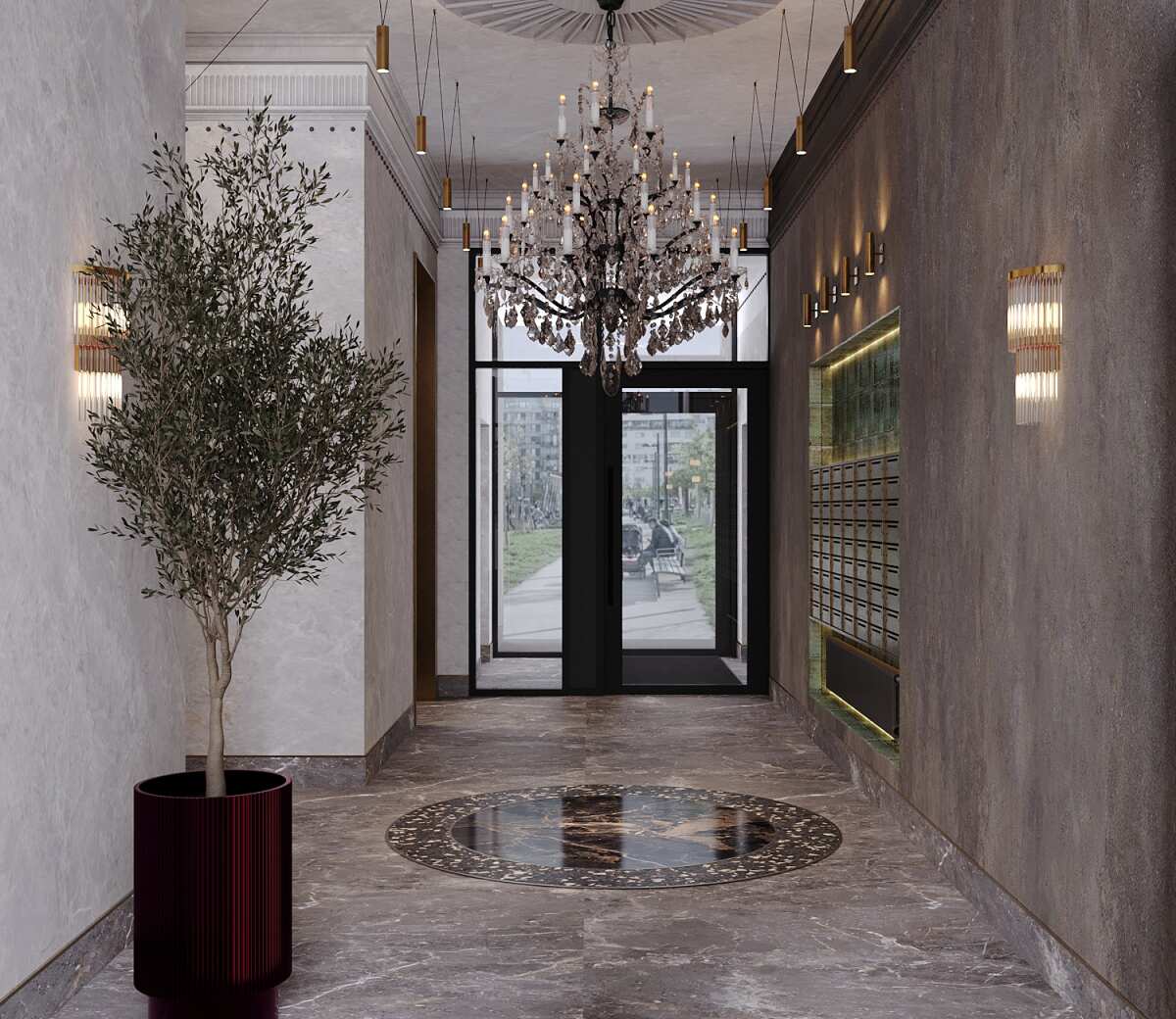 Холлы выполнены в авторском дизайне с отделкой натуральным мрамором, камнем, деревом, керамикой. Роскошная многоярусная люстра в экстерьере — это смелое архитектурное решение и визитная карточка квартала. В местах общего пользования тоже позаботились о резидентах и гостях: колясочная, гостевой санузел, лапомойки. Бесшумные лифты можно вызвать без использования рук.
