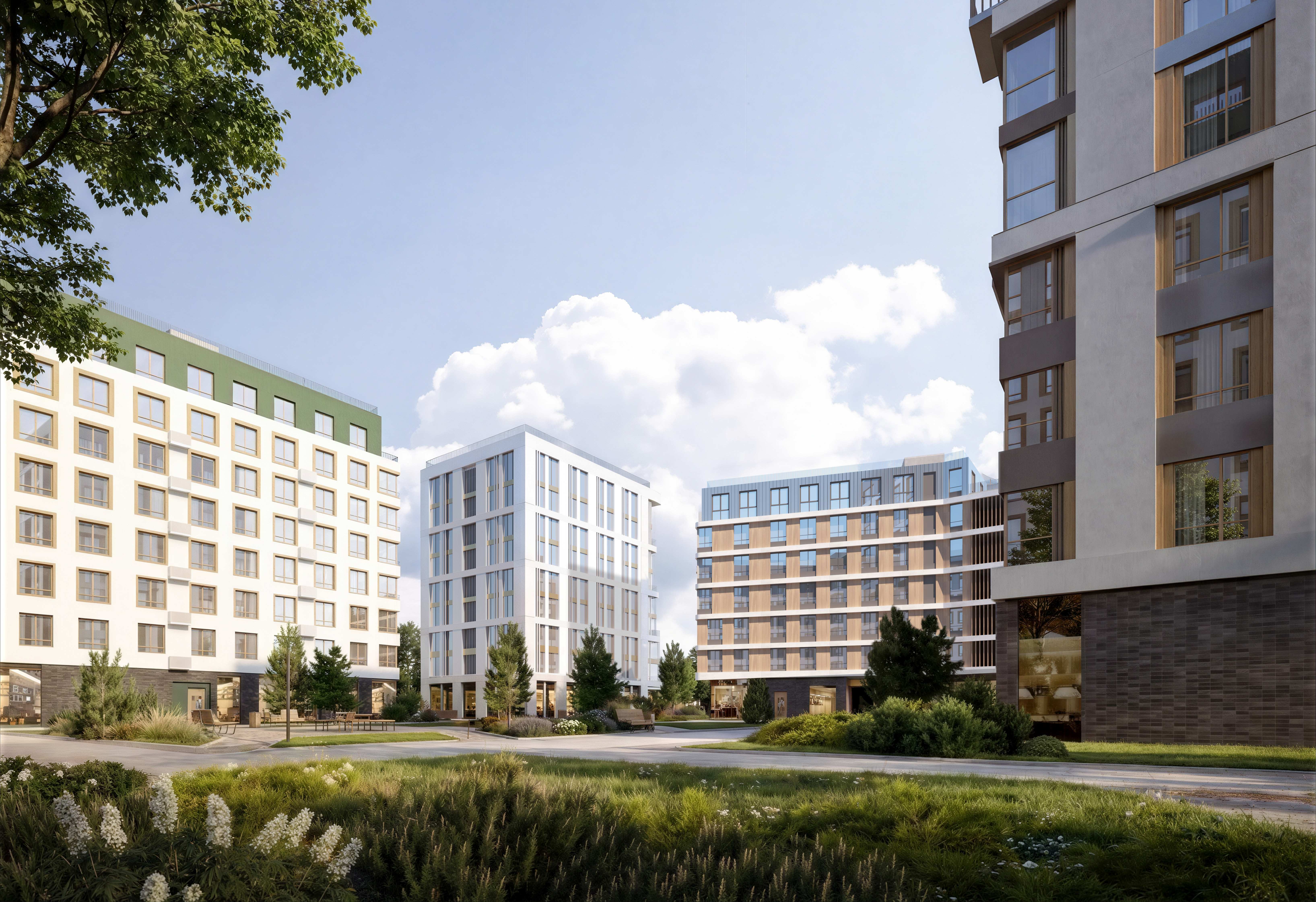 Проект предусматривает создание полноценной образовательной инфраструктуры: здесь появится школа на 550 мест и детский сад на 220 воспитанников. На первых этажах домов откроются супермаркеты, кофейни, аптеки и другие бытовые сервисы.