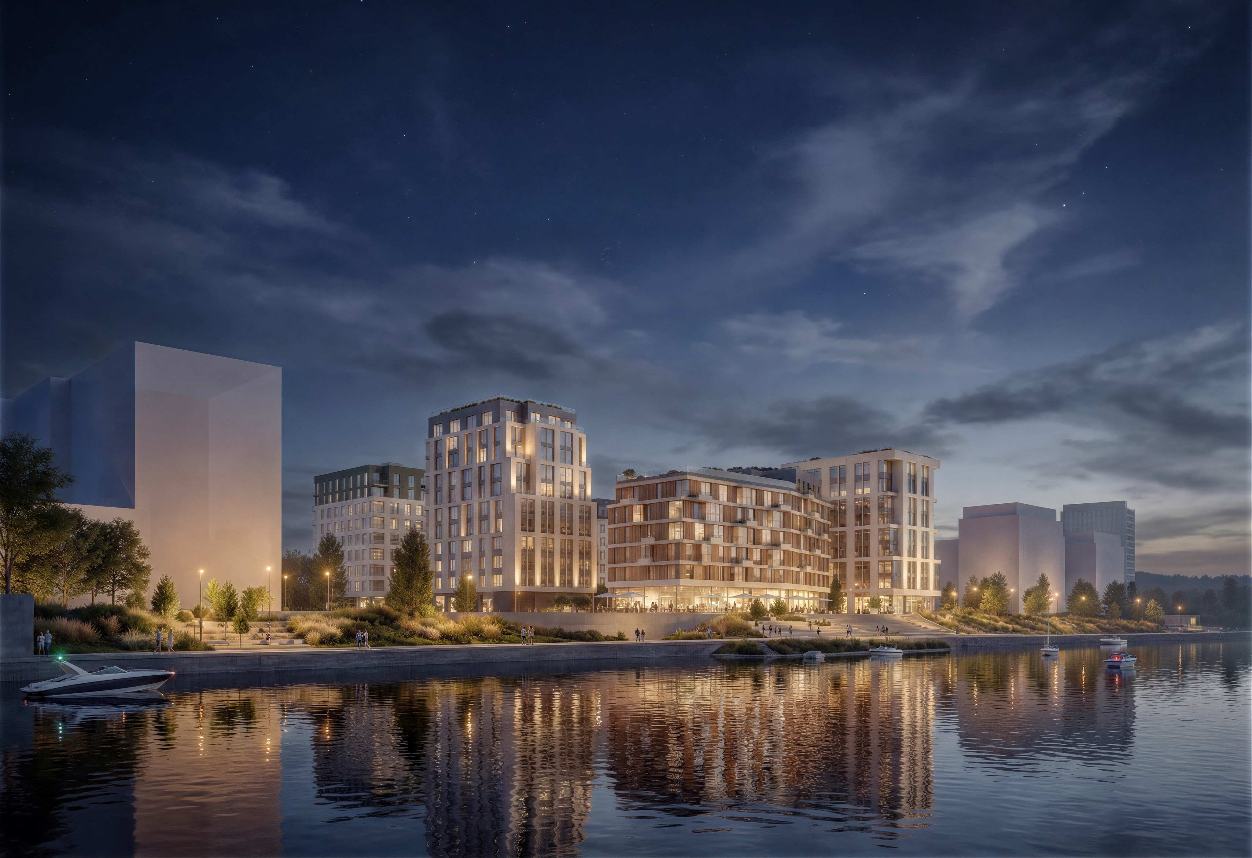 Прилегающая к комплексу часть набережной будет благоустроена для отдыха и досуга. Здесь расположатся кафе и рестораны с летними верандами, а также зоны отдыха: зеленые скверы, амфитеатр у воды, локации с качелями и беседками.